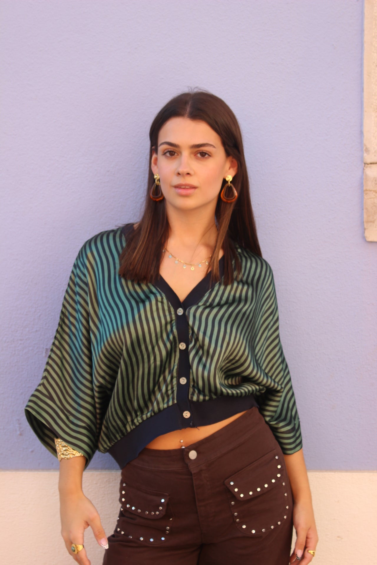 Com acabamento acetinado que reflete a luz de forma subtil, apresenta riscas em tons de verde e azul escuro que transmitem frescura e elegância. O corte curto dá-lhe modernidade e torna-o perfeito para ser usado de diferentes formas, como top ou como sobreposição leve por cima de um vestido. Uma peça que se transforma contigo e nunca passa despercebida.