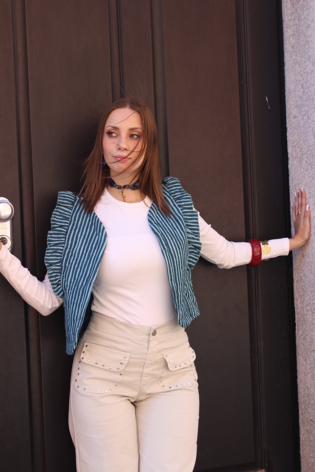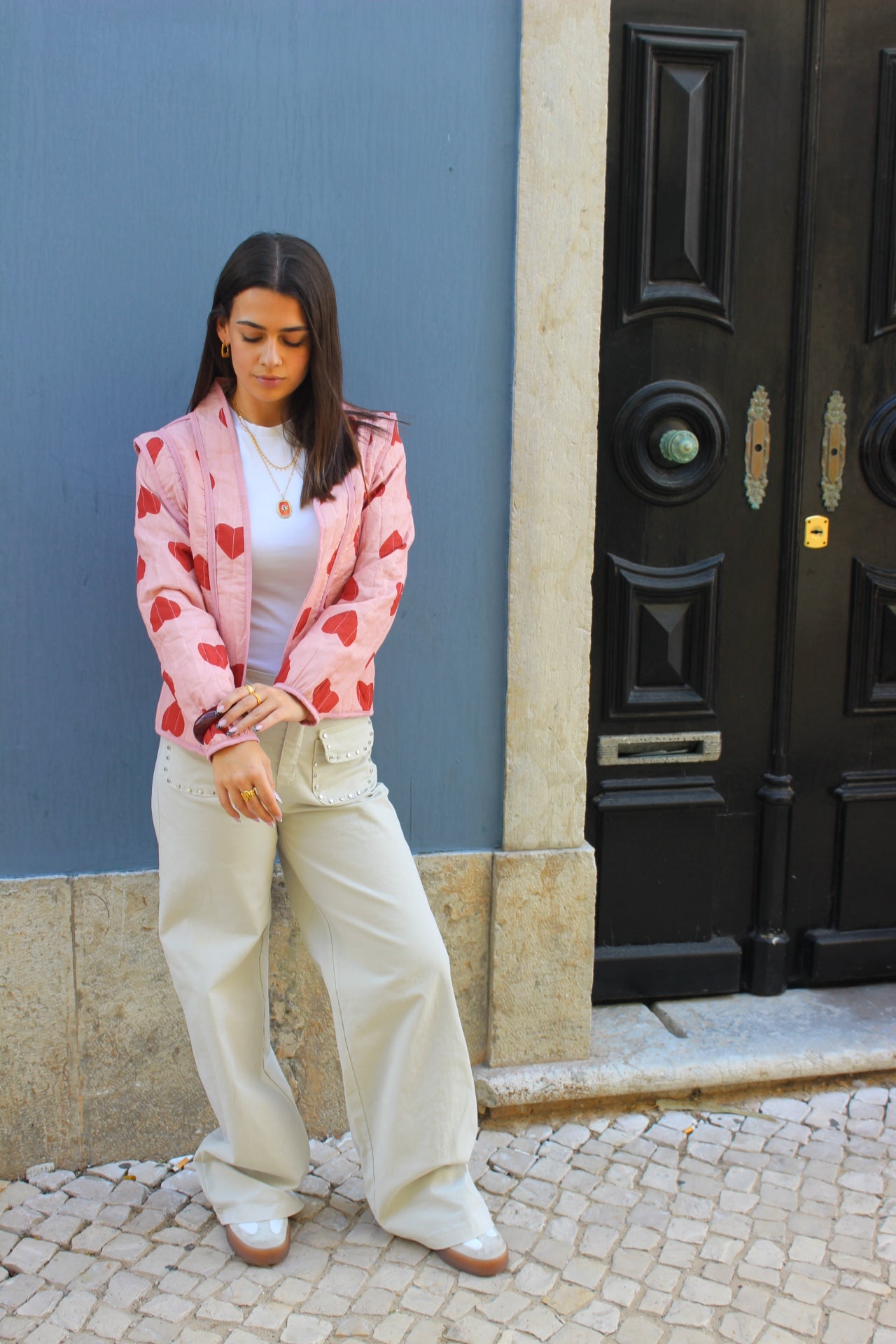 Estas calças são pura confiança. O tom bege profundo é sóbrio e versátil, mas os detalhes em tachas metálicas dão-lhe a ousadia certa para transformar qualquer look. São uma fusão entre o clássico e o irreverente: práticas e confortáveis, mas com aquele brilho inesperado que revela personalidade. Uma peça pensada para mulheres que querem vestir atitude sem perder o conforto do dia a dia.