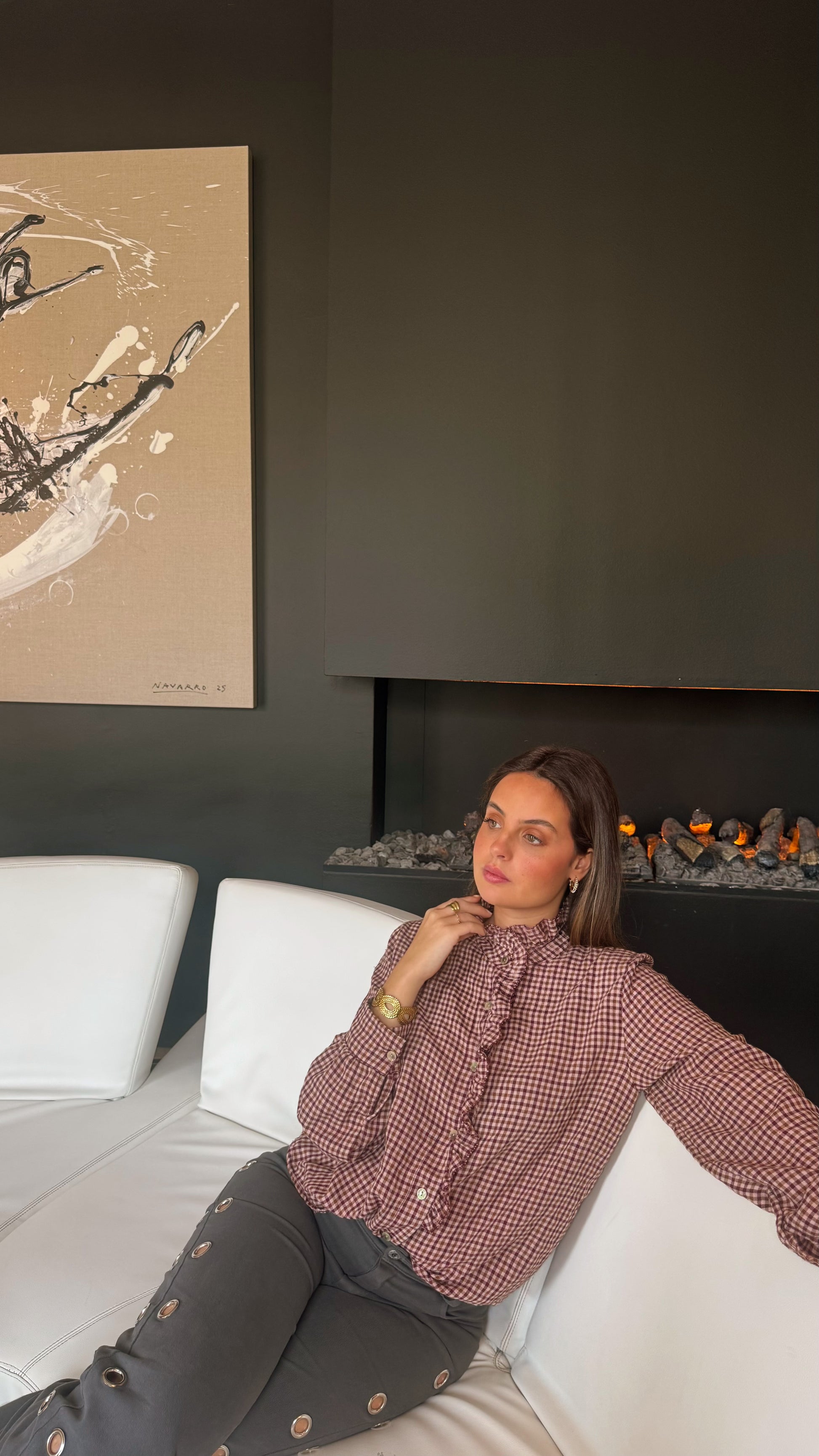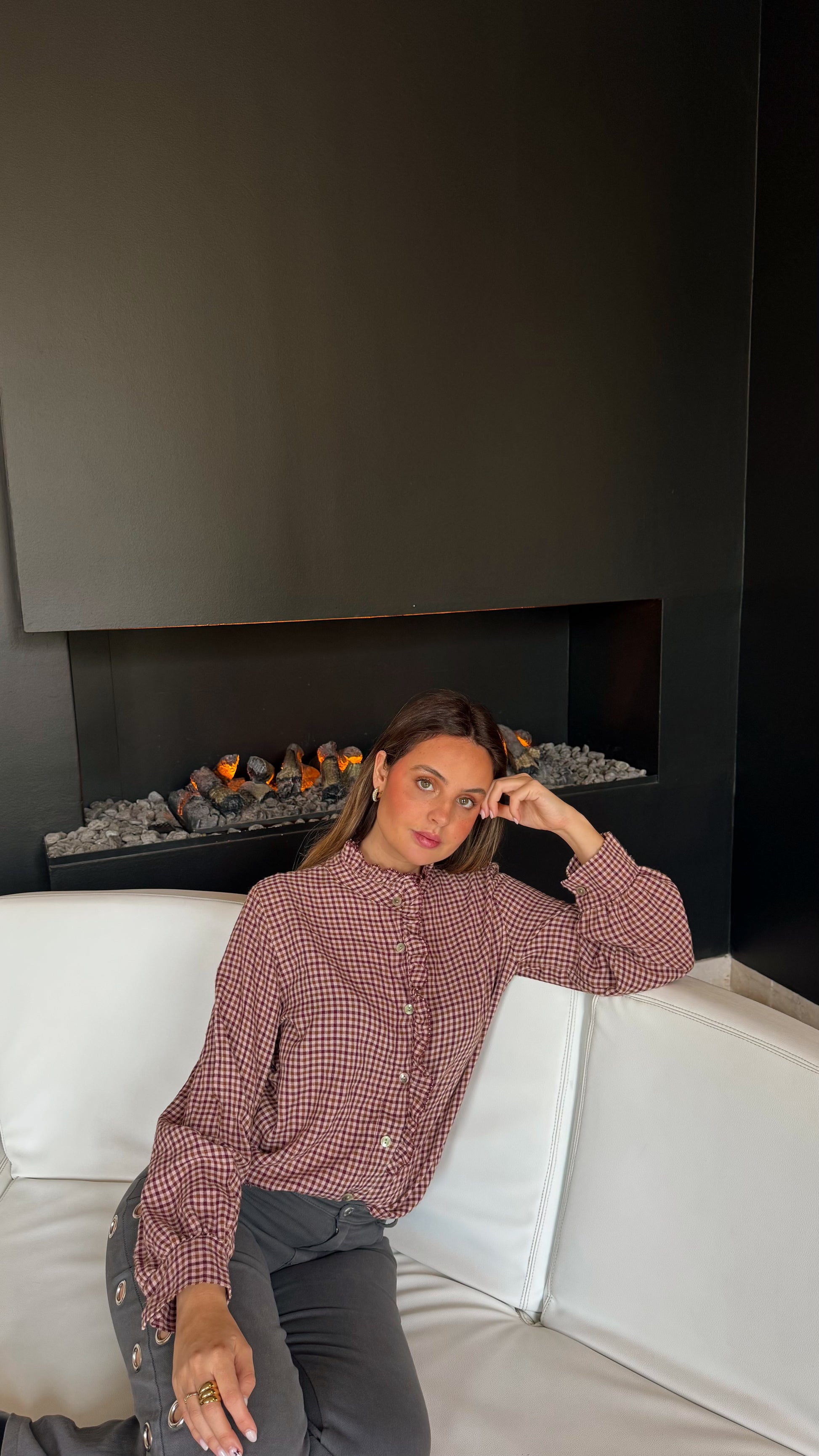 Camisa em padrão aos quadrados, com gola subida em folho que confere um toque romântico e elegante à peça. Possui também folho ao longo da frente, junto aos botões, criando um detalhe delicado e feminino.