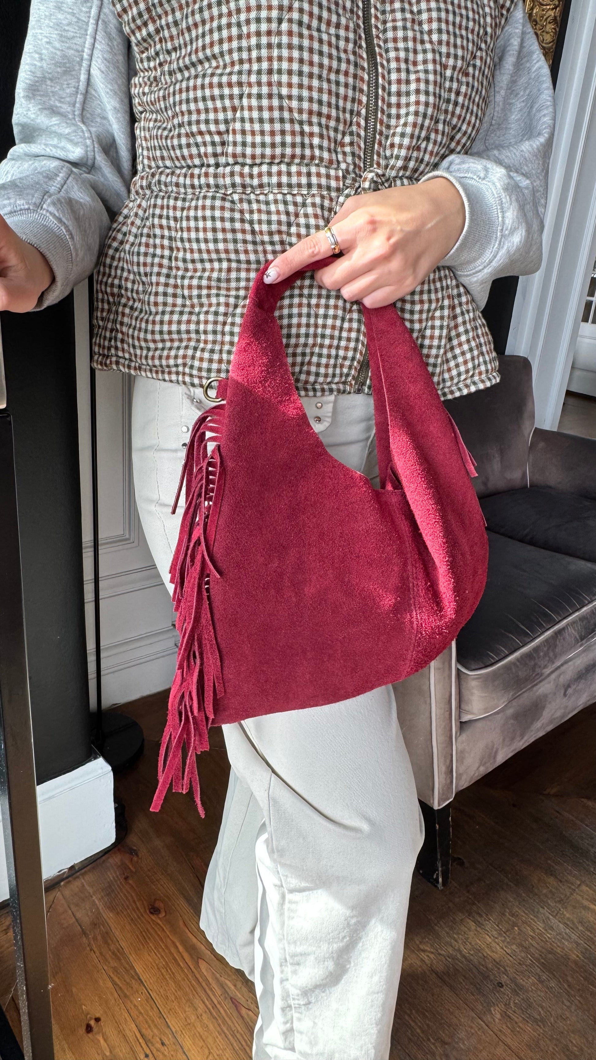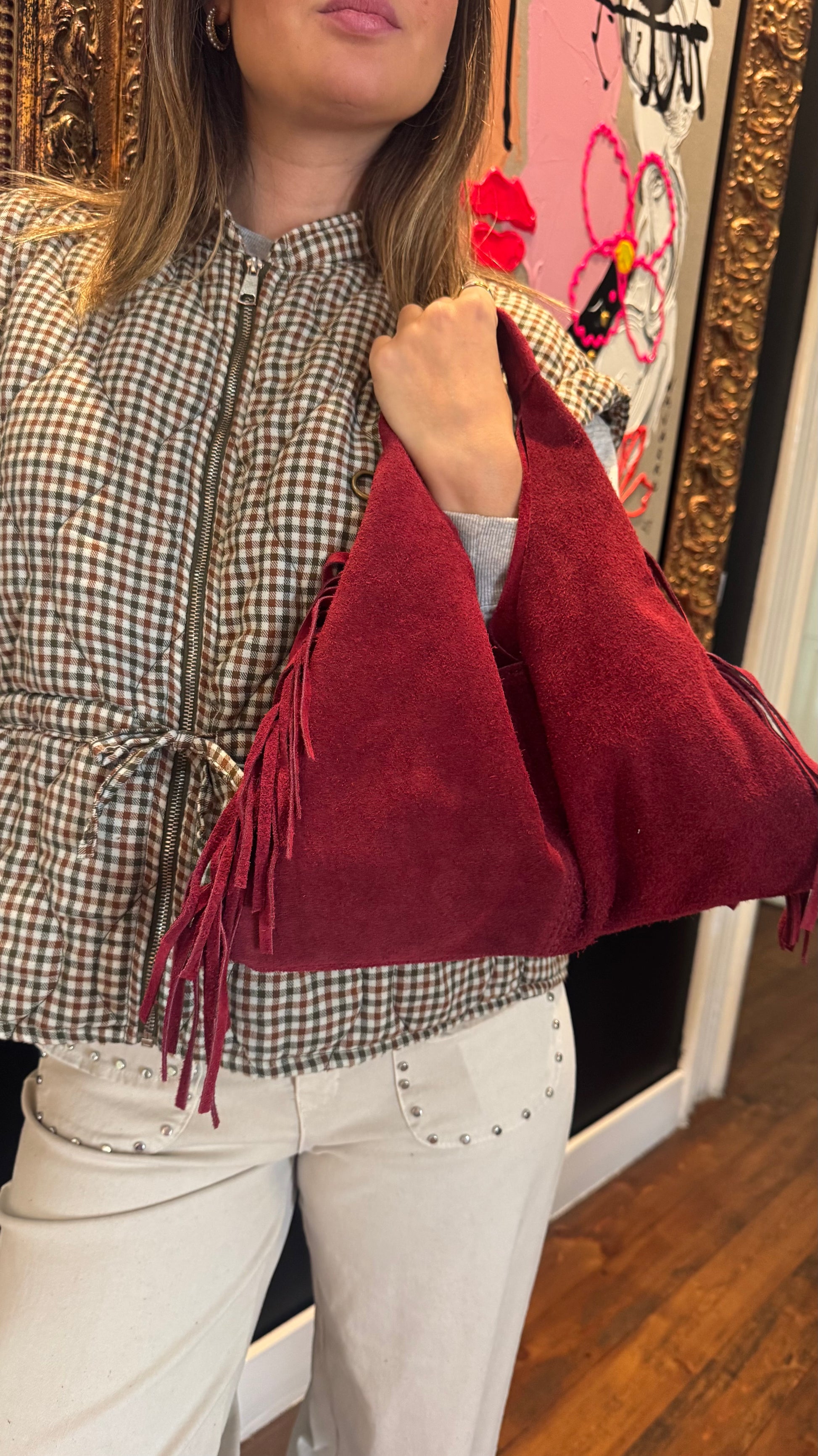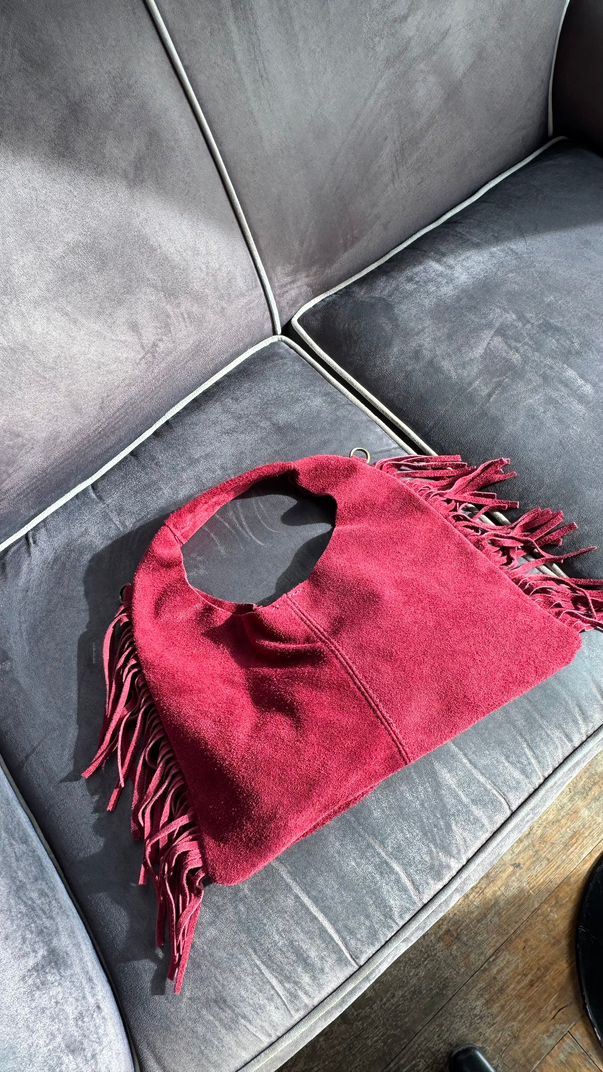 Carteira em pele de alta qualidade, em tom bordo, com detalhe de franjas na lateral que adiciona movimento e estilo à peça. Inclui uma alça interior opcional, tornando-a prática e versátil. Elegante e funcional, é perfeita para completar qualquer look com um toque sofisticado.