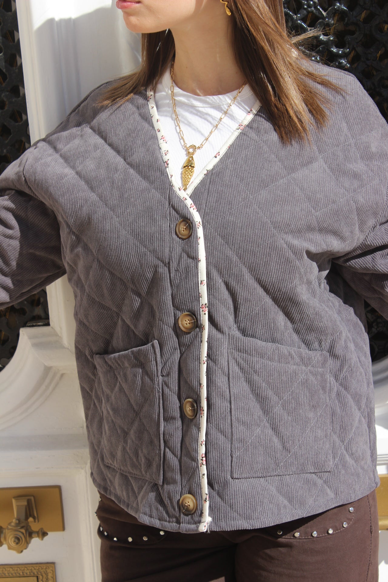 Este casaco é puro aconchego com um toque de mistério. À primeira vista, discreto no seu cinzento elegante, mas por dentro guarda um segredo: um jardim de flores que só revela a quem se aproxima. É a peça que representa a dualidade feminina, forte por fora, delicada e cheia de vida por dentro. Macio, quente e envolvente, é como um abraço que acompanha os teus dias frios, sem nunca perder a sofisticação.